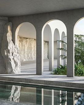 I made this image at a time where I was looking at a multitude of these images so these are some that stuck with me in particular. The render that I created out of that was very much a study of material and shape that got a little out of hand: structurally I have been obsessed with this nihilistic building style which is not a building at all but implies there was an attempt. Especially the use of the arches was something I wanted to implement already for a long time. I kept seeing them everywhere and it fascinated me. That, and then adding the feeling that all-tile environments give me: a warm memory of childhood.