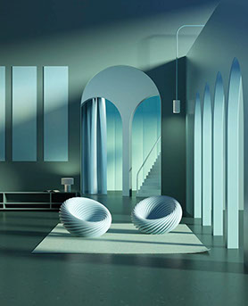 I wanted to make the room look soft but at the same time obstructive and rigid, and this style was perfect for that. The bed, chair, and bedside table are all mounted to the room they are in, making it impossible to move them. Perfect for a totalitarian world where it is all about controlling civilians.