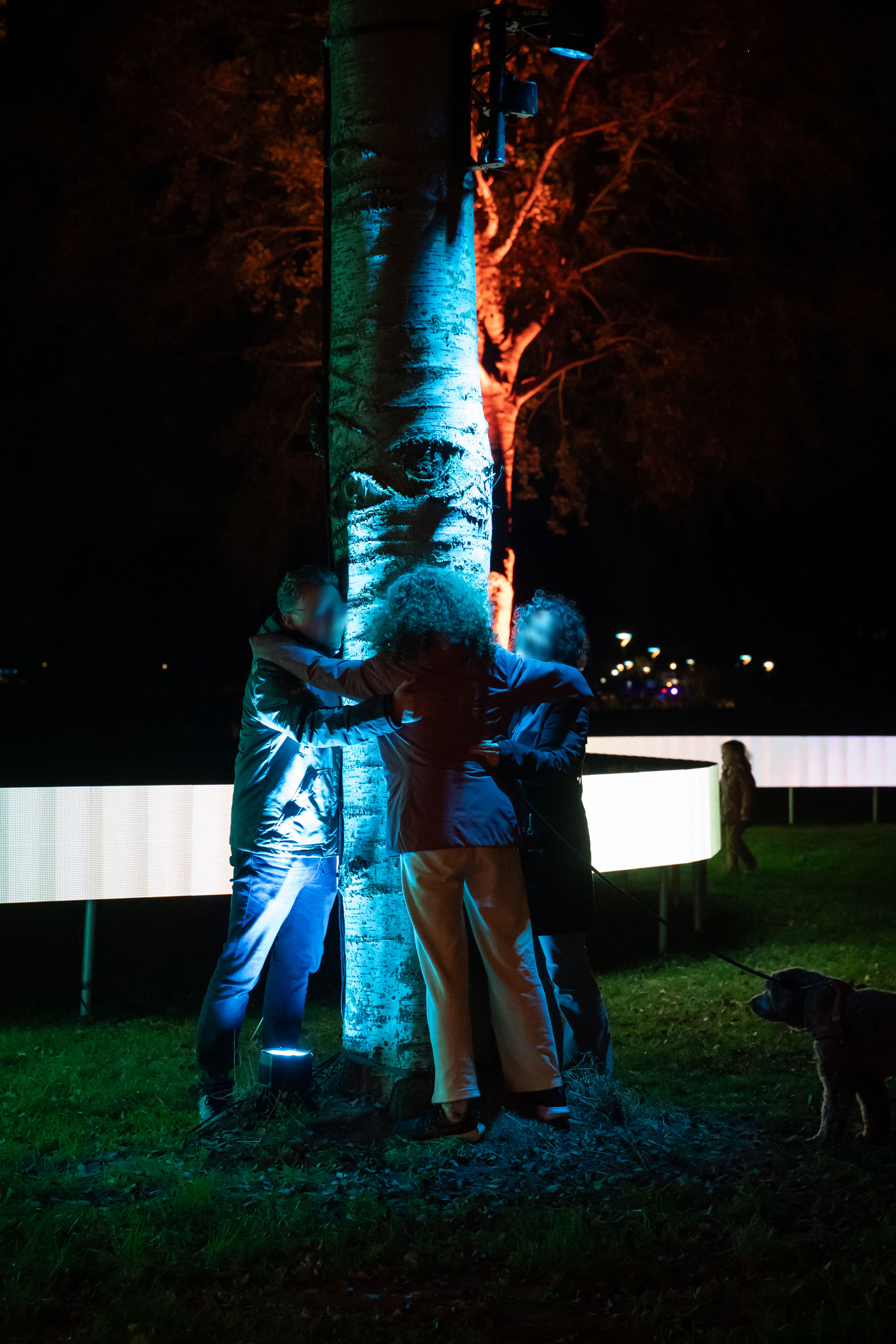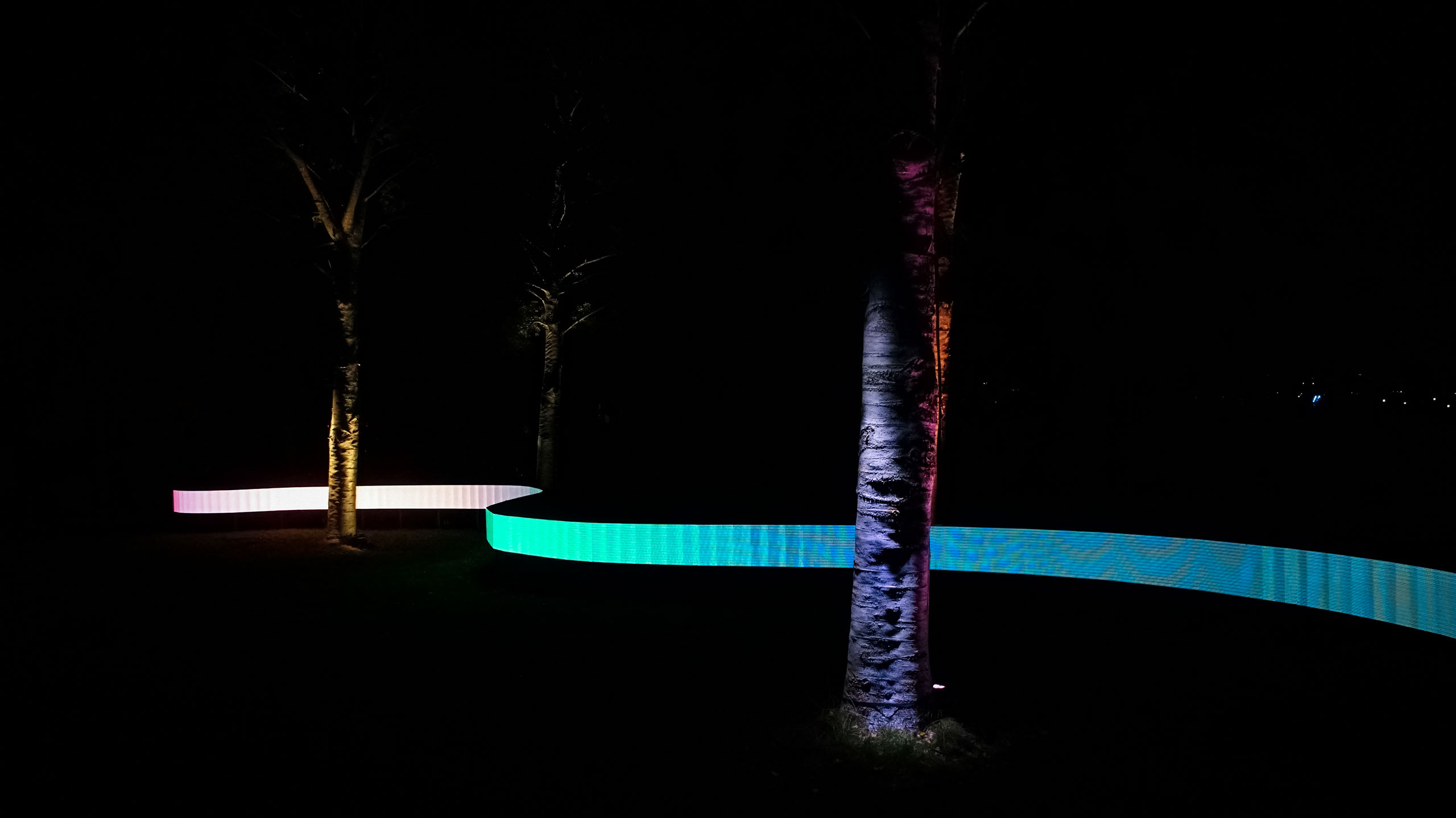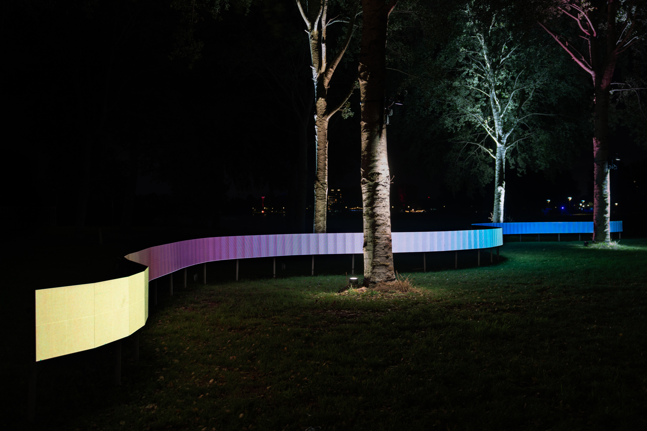 Aura is the product of a few years of development towards an immersive ball of light, constructed out of multiple pillars. A visitor is invited to envelop themselves in the work, and to experience its reactions to the environment. Aura responds to impulses from living creatures as we would: when stressed and overwhelmed, she responds with a fitting audiovisual stimulus for the viewer to respond on in their turn, leading to either a buildup of sound and light until Aura falls silent when it all becomes too much, or to a symbiotic relationship of piece and quiet, a meditative state.