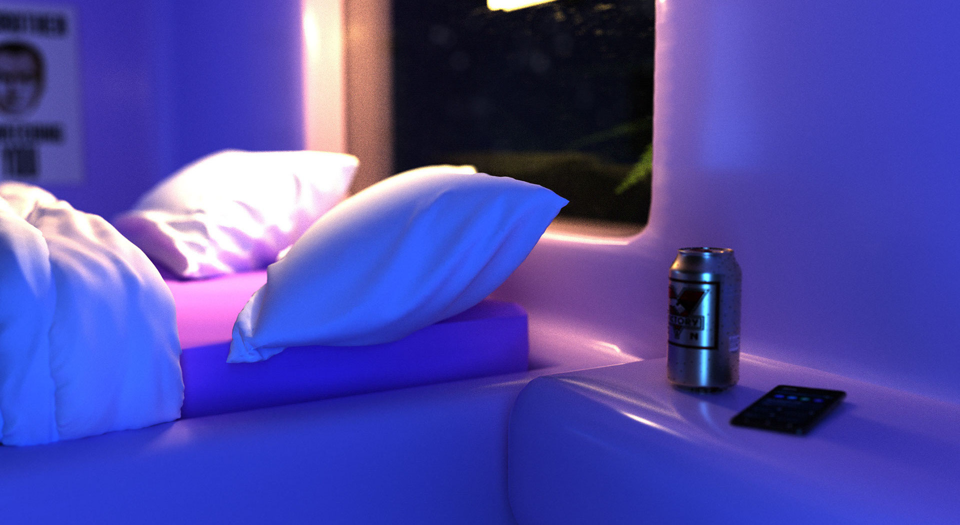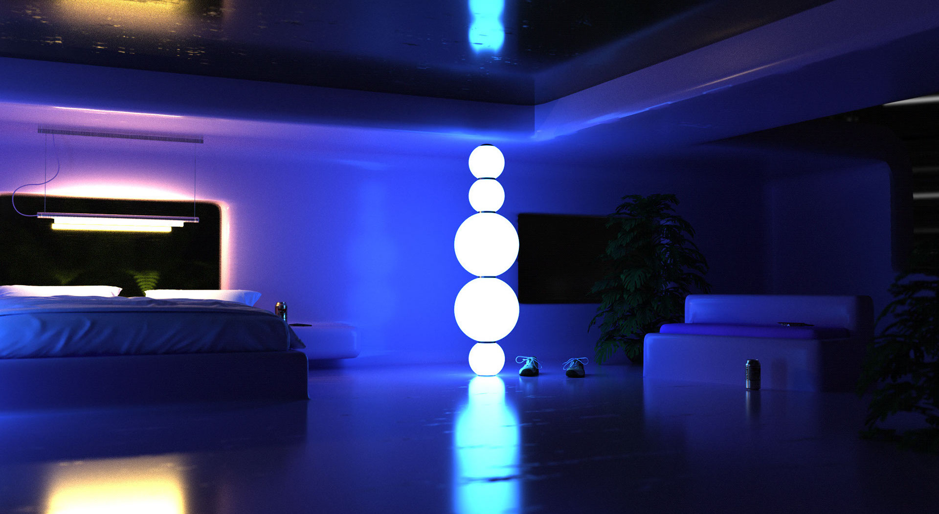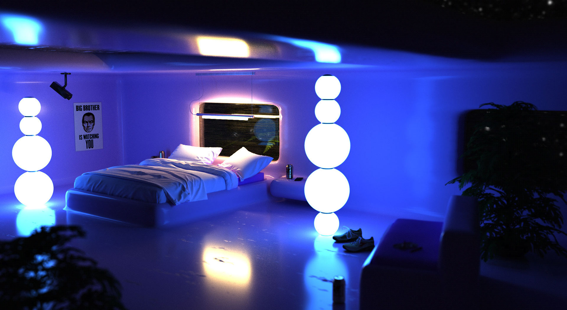 I am a huge fan of Orwellian concepts, and I wanted to create something which looks oddly soothing and futuristic, but at the same time cold and lifeless with some lingering tension. In this image I've added a few references to items from the book 1984, to hint that the person living in this room might not actually live in a Utopian society, but rather in a totalitarian society where their every move is being monitored, every sip is being administered with what potentially could be some sort of mind limiting additive, meanwhile being completely blinded for who is the real enemy and idolising them. Shoes, to imply someone is home, but not in view. We are watching, are we them? On the bedside table, a phone. Because in a futuristic Orwellian world, there would be no need for a big screen. In a futuristic Orwellian world, we carry it - everywhere. And in the shadows, invisible for the viewer, on a beautiful but uncomfortably looking sofa lays a book and a pen, which reads 'brave new world' - where it all started.