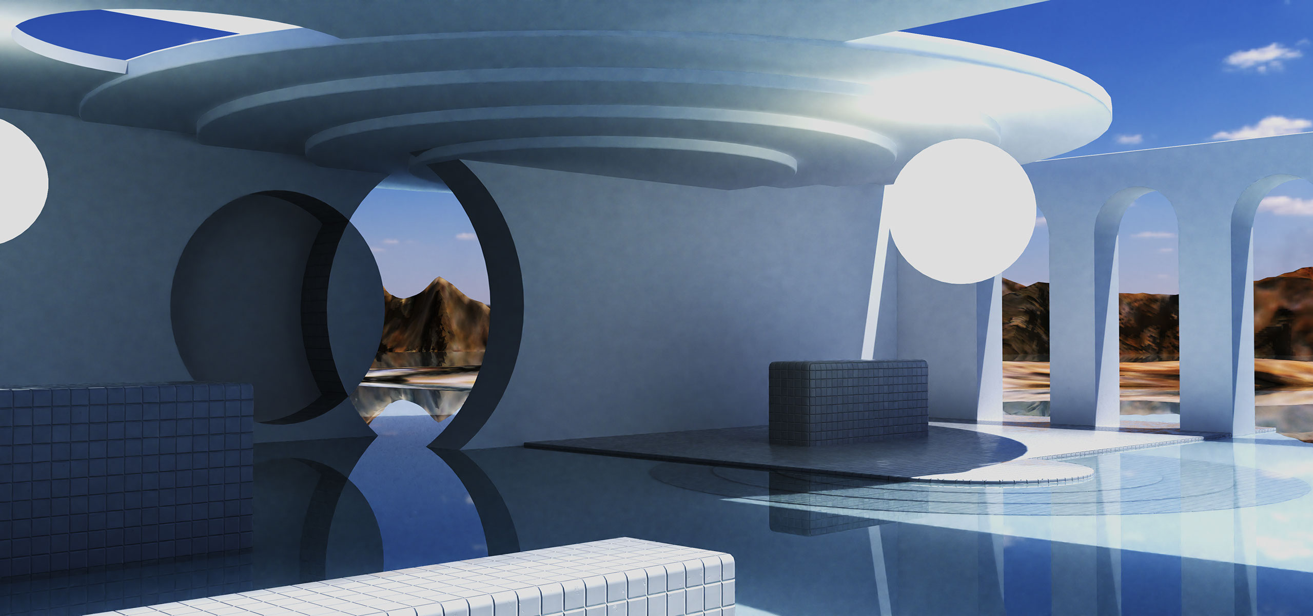 Have you ever been at an swimming pool after closing time, when there is no one around? It can be quite eery, and so, so quiet. I wanted to recreate this, but as a memory or a dream: constructed to feel and look familiar at first, but making you realise right after that it could never exist. Yet it gives this feeling of familiarity.