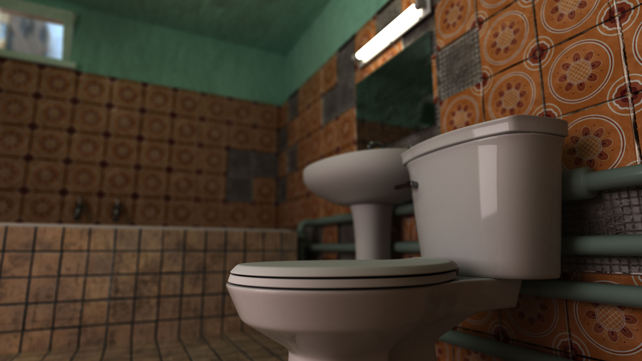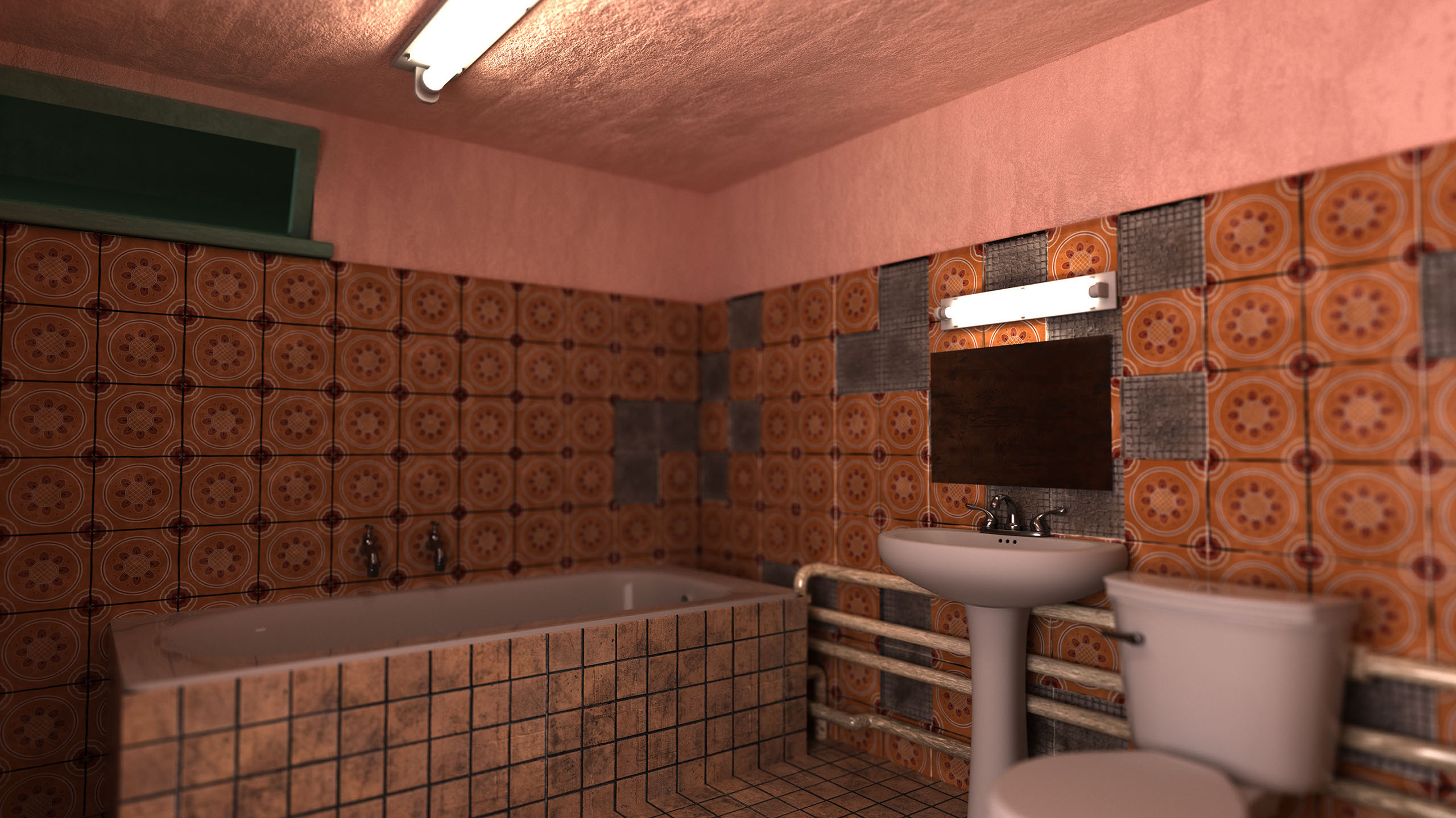 I made this image at a time where I was looking at a multitude of these images so these are some that stuck with me in particular. The render that I created out of that was very much a study of material and shape that got a little out of hand: structurally I have been obsessed with this nihilistic building style which is not a building at all but implies there was an attempt. Especially the use of the arches was something I wanted to implement already for a long time. I kept seeing them everywhere and it fascinated me. That, and then adding the feeling that all-tile environments give me: a warm memory of childhood.